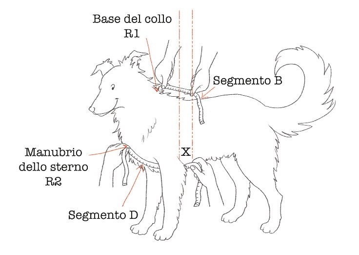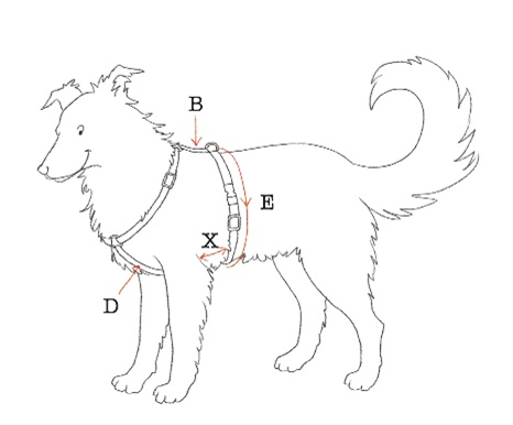 The correct choice of B and D's lenght (based on what is shown by the configurator) will allow the segment E, once the harness is closed, to stay away from the dog's armpits and scapulas, the distance X will have to be of about 4 fingers.