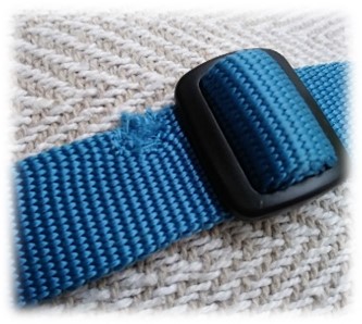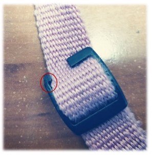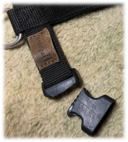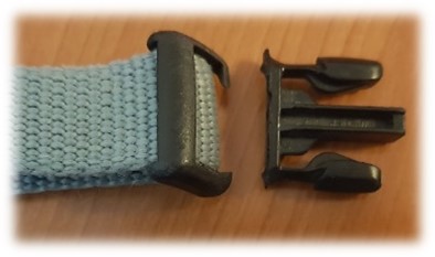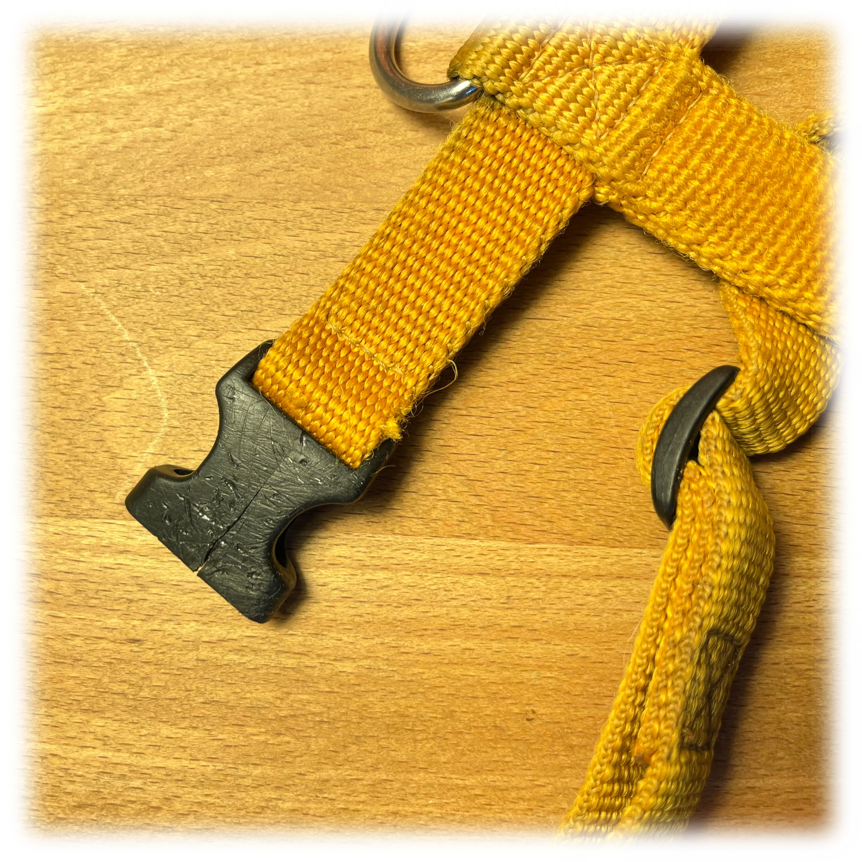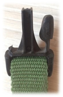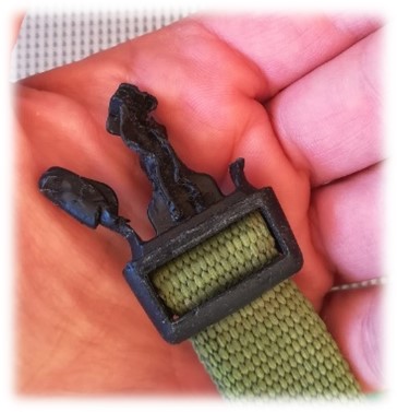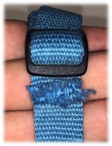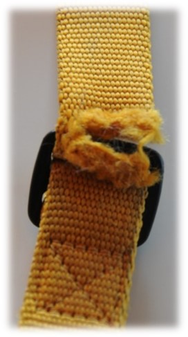 Damage to the "female" piece of the buckle caused by biting (cost for repairing the 2 adjacent webbing pieces: 18,00€) |